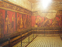 秘儀荘: 自家の中にワインを造る道具なども備わったポンペイ城壁外の別荘。当時上流階級の婦人達の間で流行した密教=バッカス教・入信儀式を描いたとされている「ポンペイの赤」として有名な赤色がくっきり残るフレスコ画 注:バッカス神(ギリシャ名=ディオニッソス神)酒の神として有名 (注:当時の赤色の絵の具は小さな巻貝の一種から取り出して作ったとの事)